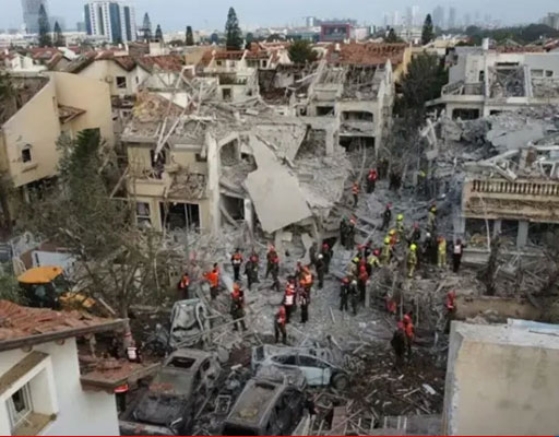 دوسری جانب اسرائیلی ذرائع کا کہنا ہے کہ ایران کی طرف سے 200 بیلسٹک میزائل داغے گئے، جن میں سے کئی کو فضا میں ہی تباہ کر دیا گیا۔ تاہم کچھ میزائل تل ابیب کے مختلف علاقوں میں گرے، جن میں اسرائیلی وزارتِ دفاع کی عمارت بھی شامل ہے۔ گش دان کے علاقے میں بھی دو میزائل گرنے کی اطلاعات ہیں، جن کے باعث بڑے پیمانے پر آگ بھڑک اٹھی۔