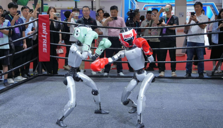 چینی کمپنی Unitree Robotics کے بوتھ پر، تماشائی ایک اعلیٰ توانائی والے ہیومنائیڈ روبوٹ جنگی میچ کے لیے جمع تھے۔ مقابلہ کرنے والے، نئے اپ گریڈ شدہ G1 جنگی ہیومنائڈز، سائیڈ ککس، ہکس، اور کمبینیشن پنچز، اور دستک ہونے کے بعد تیزی سے اپنی منزلیں دوبارہ حاصل کر لیں۔