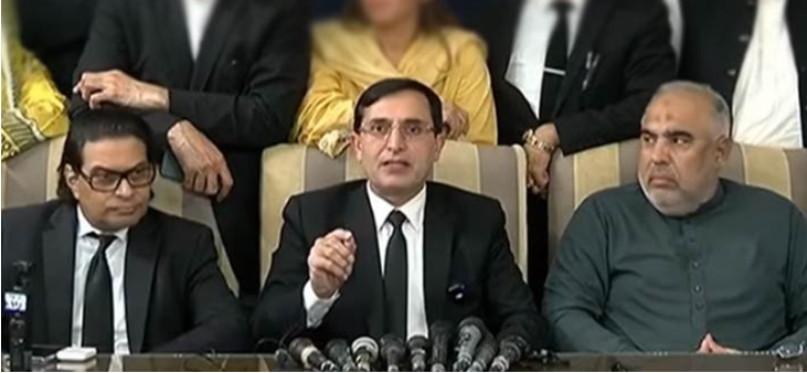 چیرمین پی ٹی آئی کی سیکرٹری جنرل سلمان اکرم راجہ اور رکن قومی اسمبلی اسد قیصر کے ہمراہ پریس کانفرنس ۔