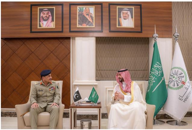 راولپنڈی: چیف آف آرمی سٹاف اور چیف آف ڈیفنس فورسز فیلڈ مارشل سید عاصم منیر نے سعودی عرب کا دورہ کیا جہاں انہوں نے سعودی وزیر دفاع شہزادہ خالد بن سلمان سے ملاقات کی۔