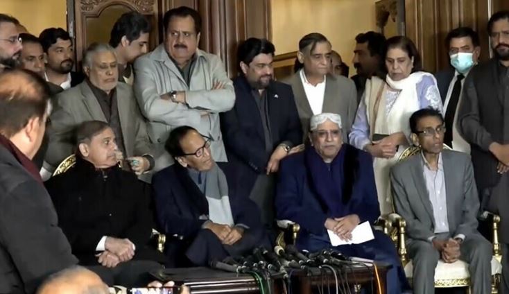 مسلم لیگ(ق) کے سربراہ چوہدری شجاعت حسین کے گھر پر شہباز شریف، خالد مقبول صدیقی اور دیگر قائدین کے ہمراہ پریس کانفرنس کرتے ہوئے پیپلز پارتی کے شریک چیئرمین آصف علی زرداری نے کہا کہ آج ہم نے فیصلہ کیا ہے کہ آپس میں مل بیٹھ کر حکومت بنائیں گے اور پاکستان کو مشکلوں سے نکالیں گے۔ان کا کہنا تھا کہ ہمیں معیشت، دہشت گردی یا مفاہمت سمیت پاکستان میں جو بھی مشکلات پیش آ رہی ہیں، ان کا حل نکالیں گے۔آصف علی زرداری نے کہا کہ مفاہمت کے عمل میں پاکستان تحریک انصاف بھی شامل ہے، ہم چاہتے ہیں کہ وہ بھی مفاہمت کے اس عمل کا حصہ بنے، ہر سیاسی طاقت مفاہمت کے عمل کا حصہ بنے، ہم سے بات کرے۔ہم چاہتے ہیں معاشی، دفاعی ایجنڈا اور دیگر یکساں چیزیں لے کر ہم ساتھ چلیں اور ہم میاں صاحب اور دوسرے دوستوں کو ہم کامیاب کرائیں تاکہ پاکستان اور اس کے عوام کو کامیاب کرا سکیں۔ہمیں پتا ہے کہ کتنا قرض چڑھ چکا ہے اور ہمیں آنے والے وقتوں میں قرض کی کتنی قسطیں دینی ہیں، ہر چیز پر نظر رکھتے ہوئے ہم نے فیصلہ کیا ہے کہ ہم آپس میں مل بیٹھیں۔زرداری نے کہا کہ مخالفت انتخابی مہم کی حد تک تھی، ہم ایک دوسرے کے خلاف الیکشن ضرور لڑے ہیں اور جو مخالفت کی گئی وہ انتخابی مہم کی حد تک تھی، ہماری سیاسی طور پر کوئی مخالفت نہیں ہے، ہم بیٹھ سکتے ہیں، مل سکتے ہیں، چلا سکتے ہیں اور ملک کو سنبھال سکتے ہیں۔