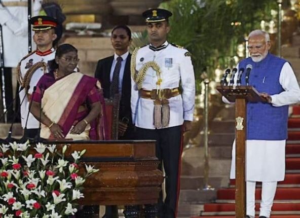 نئی دہلی(مانیٹرنگ ڈیسک) نریندرمودی نے تیسری مدت کے لیے بھارت کے وزیراعظم کی حیثیت سے حلف اٹھالیا جہاں ان کے ساتھ اتحادی حکومت کے 72 وزرا نے بھی حلف اٹھایا۔خبرایجنسی رائٹرز کی رپورٹ کے مطابق صدارتی محل راشٹراپتی بھاون میں منعقدہ تقریب میں صدر دروپادی مورمو نے نریندر مودی سے حلف لیا اور تیسری مرتبہ بھارت کا وزیراعظم بننے کا ریکارڈ برابر کردیا، اس موقع پر خطے کے 7 ممالک کے رہنماؤں، بالی ووڈ اسٹارز، صنعت کاروں سمیت ہزاروں شخصیات نے تقریب میں شرکت کی۔
