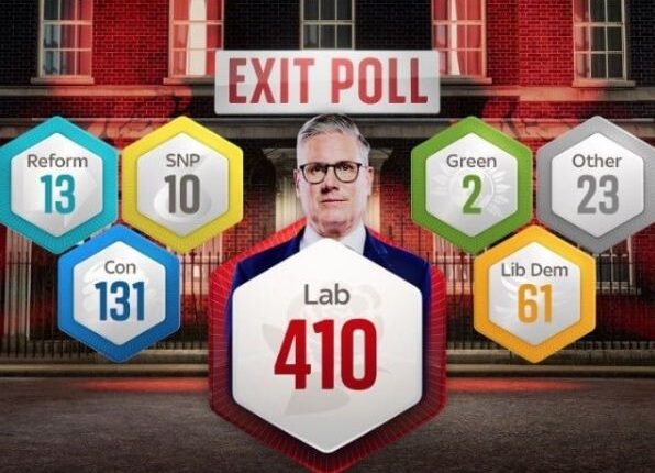 ایگزٹ پول کے مطابق لیبر پارٹی کو 650 نشستوں میں سے 410 نشستوں پر برتری حاصل ہے، جبکہ موجودہ حکمراں جماعت کنزرویٹو پارٹی کو صرف 131 نشستیں ملنے کا امکان ہے۔موصول ہونے والے نتائج کے مطابق لیبر ڈیموکریٹک پارٹی کو 61، ریفارمز کو 13 اور اسکاٹس نیشنل پارٹی کو 10 نشستوں پر برتری حاصل ہے۔